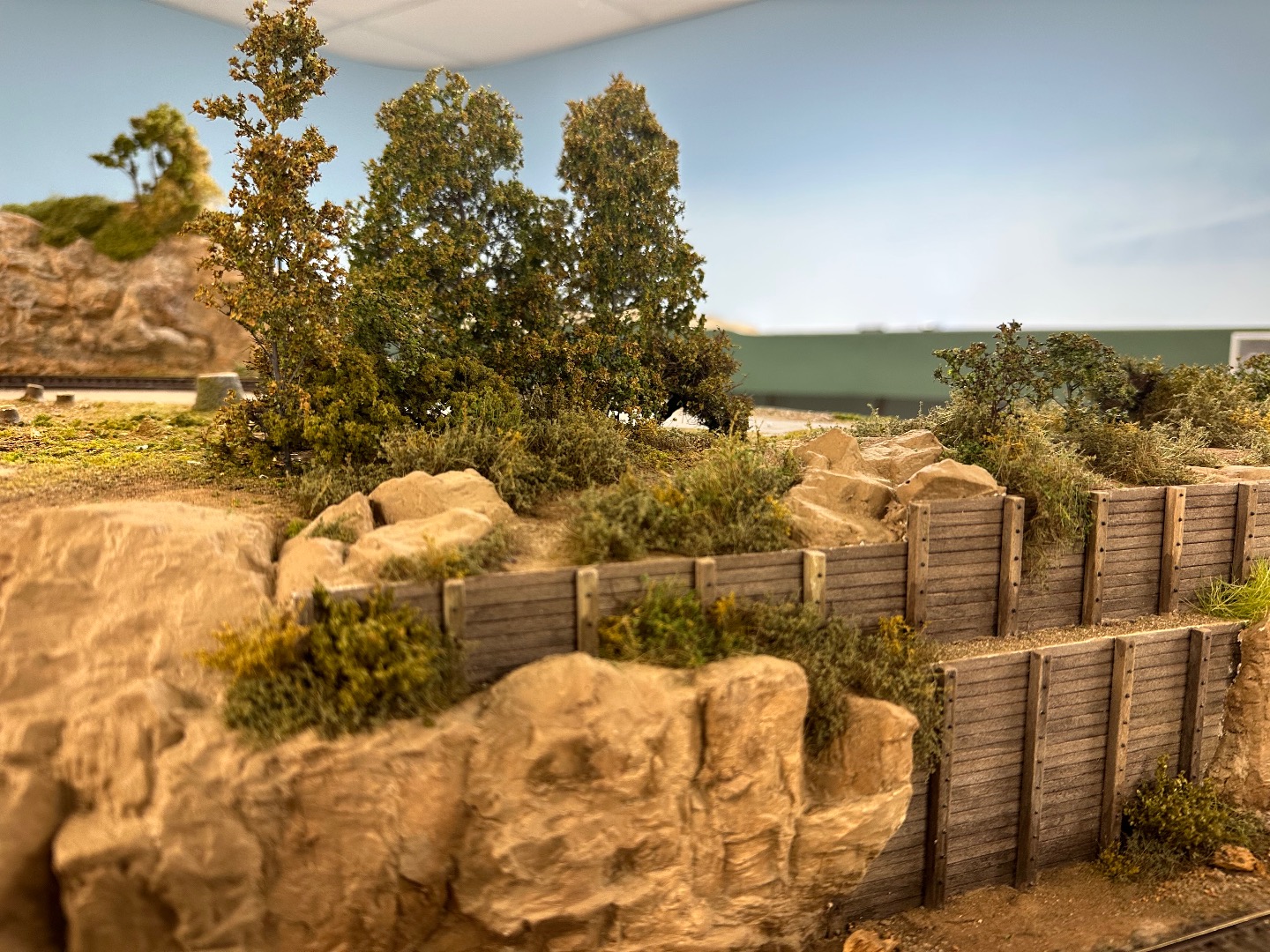 Styrofoam covered with sculptamold painted and covered with ground foam and static grass; use Scenic Express Supertrees as background trees and scratch build trees in the foreground
