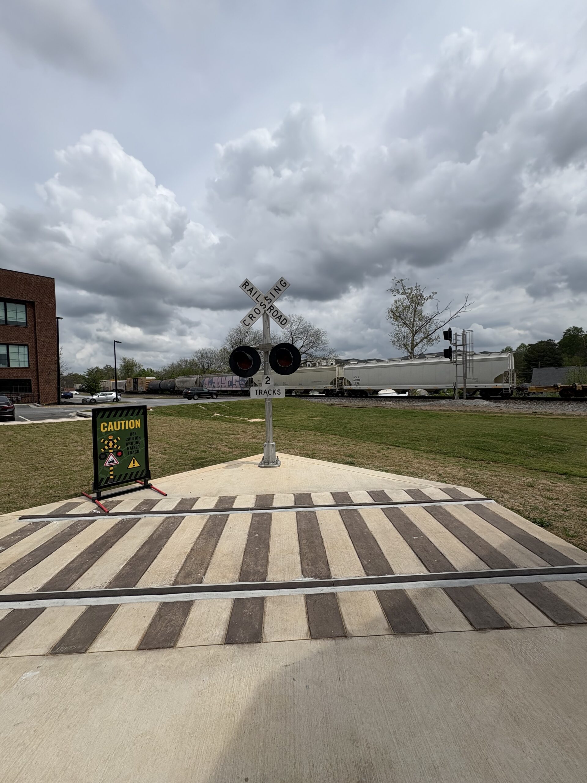 The structure is fully ADA accessible and features design elements inspired by historic train depots across the country, offering views of three crossings and a working railroad crossing light signal.